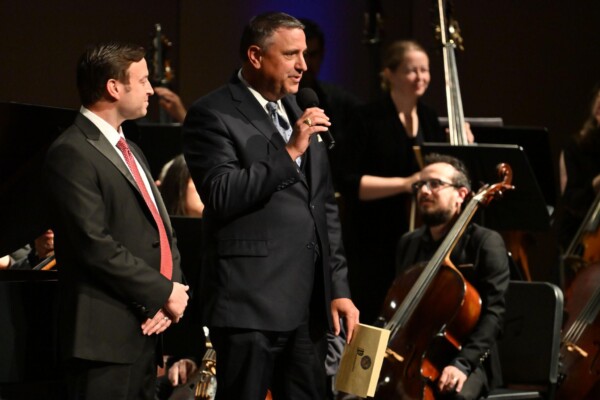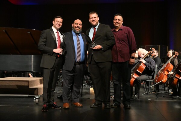 David Faskas, VBF Board President, Carlos Gonzalez, Education Chair for the Festival , and 2025 Music Teacher of the Year recipient Chris Hamelwright pause for a photo as Hamelwright receives a standing ovation from the crowd. Hamelwright, band director at Howell Middle School, was recognized at the Finale concert for revitalizing the school’s band program and mentoring countless young musicians.